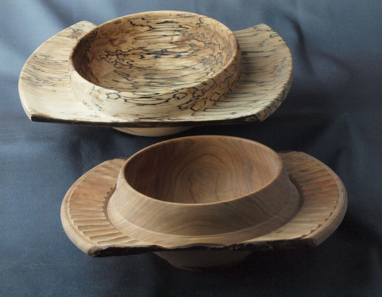 Two Axis Ale Bowls are the most complicated and even difficult to picture the process. I learned from the Canadian turner Michael Hosaluk how to do two turnings at right angles. It’s a technique often used for kitchen ladles and spoons but I love it for the possibilities here.